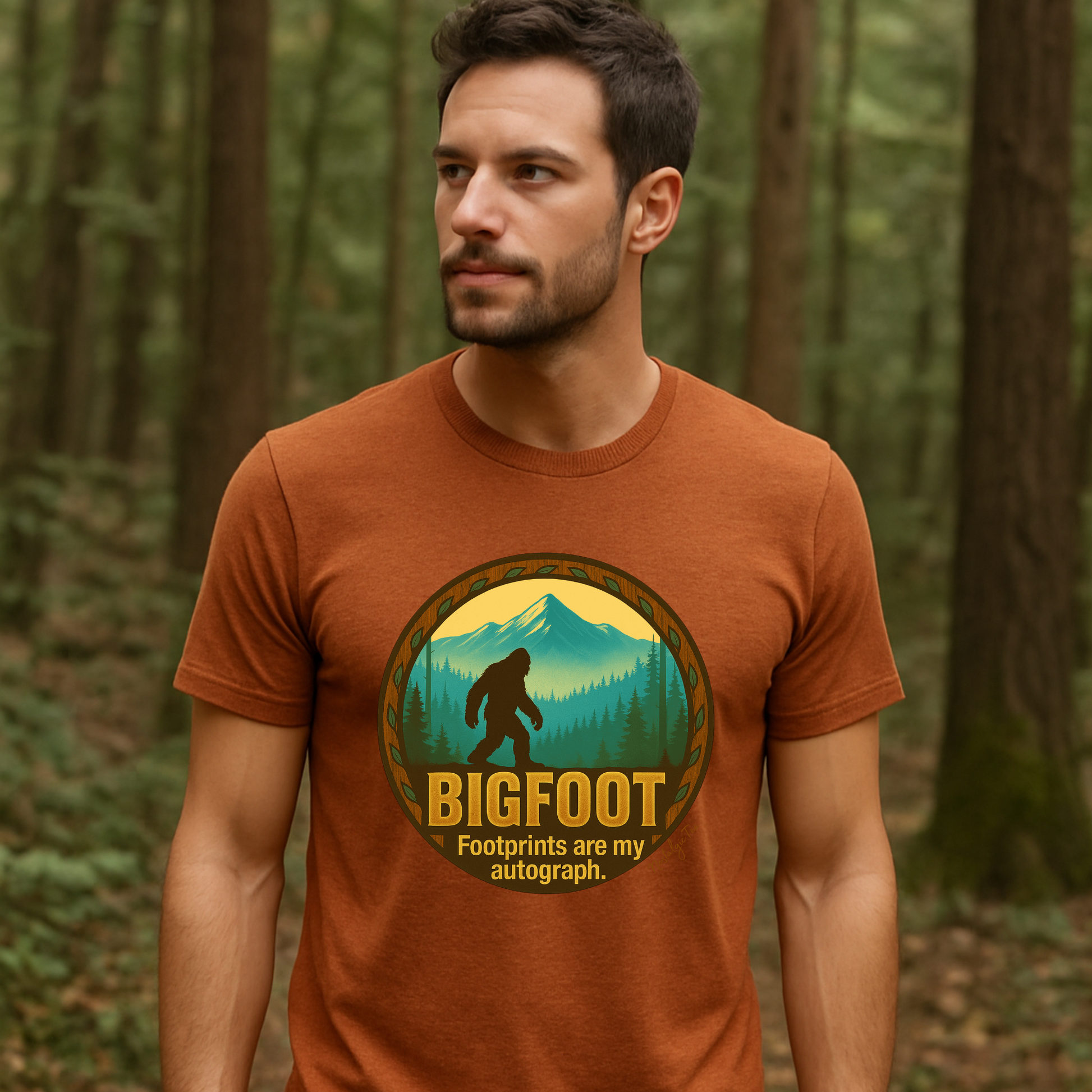 Shake up your wardrobe with our Bigfoot "Footprints are my autograph" T-shirt. The ultimate statement piece for cryptid enthusiasts and mystery hunters. This bold tee celebrates the legendary creature with an attitude that refuses to play it safe. Whether you're a devoted Sasquatch believer, a paranormal adventure seeker, or someone who appreciates unconventional humor, this shirt declares your allegiance to the unknown.